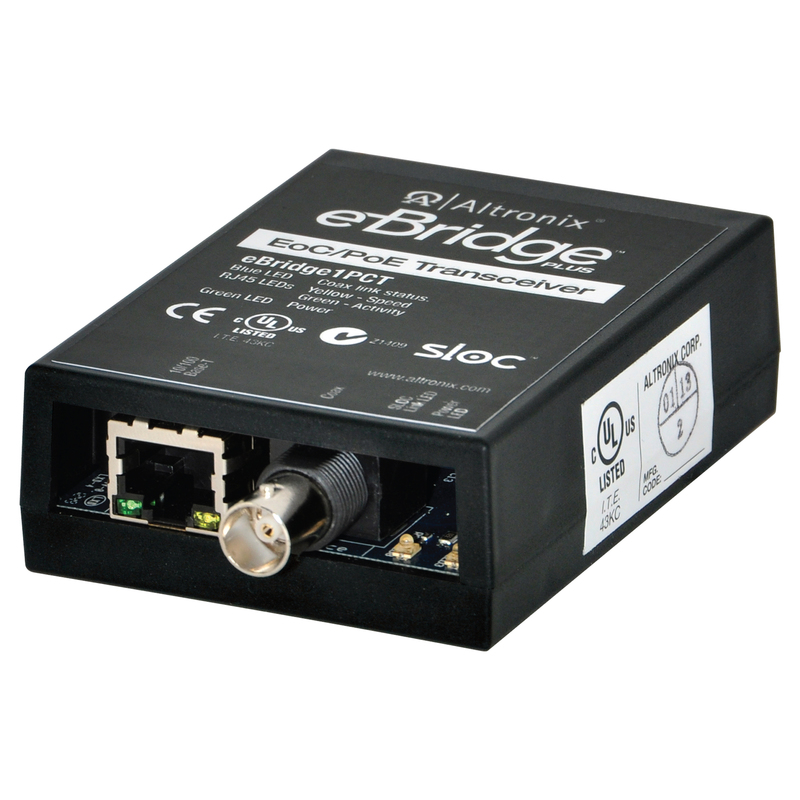 Altronix EBRIDGE1PCT Ethernet over coax Transceiver. Transmits IP video/data over coax up to 500m @ 25mbps and supports PoE (IEEE 802.3af). Compatible with eBridge1PCR, eBridge1PCRX, eBridge4PCRM, eBridge4PCRX, eBridge8PCRM, eBridge8PCRX, eBridge16PCRM and eBridge16PCRX receivers. UL/cUL Listed (UL60950-1). CE Approved.