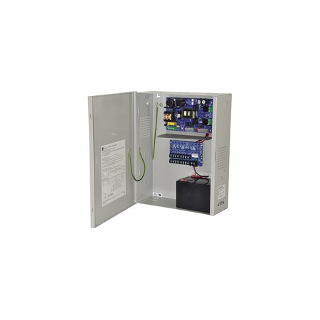 Altronix EFLOW102NX8D Power Supply/Charger w/Fire Alarm Disconnect - 12VDC @ 10 amp max. Eight (8) PTC Class 2 power-limited outputs and one (1) aux. power output, AC & battery monitoring, Low battery cutoff, Over voltage protection, encl. 15.5"H x 12"W x 4.5"D accommodates up to (2) 12VDC/12AH batteries, 115VAC input, UL Listed (UL294/UL603/UL1481), cUL Listed (ULC-S318-96). CSFM, CE Approved.