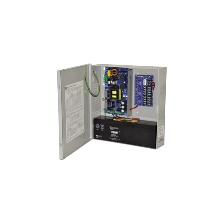 Altronix EFLOW104N8D Power Supply/Charger w/Fire Alarm Disconnect - 24VDC @ 10 amp max. Eight (8) PTC Class 2 power-limited outputs and one (1) aux. power output, AC & battery monitoring, Low battery cutoff, Over voltage protection, encl. 13.5"H x 13"W x 3.25"D accommodates up to (2) 12VDC/7AH batteries, 115VAC input, UL Listed (UL294/UL603/UL1481), cUL Listed (ULC-S318-96). CSFM, CE Approved.