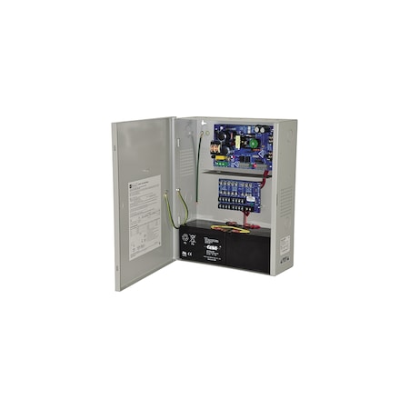 Altronix EFLOW4NX8 Power Supply/Charger w/Fire Alarm Disconnect - 12VDC or 24VDC @ 4 amp max. Eight (8) fused Class 2 power-limited outputs and one (1) aux. power output, AC & battery monitoring, Low battery cutoff, Over voltage protection, encl. 15.5"H x 12"W x 4.5"D accommodates up to (2) 12VDC/12AH batteries, 115VAC input, UL Listed (UL294/UL603/UL1481), cUL Listed (ULC-S318-96). CSFM, CE Approved.