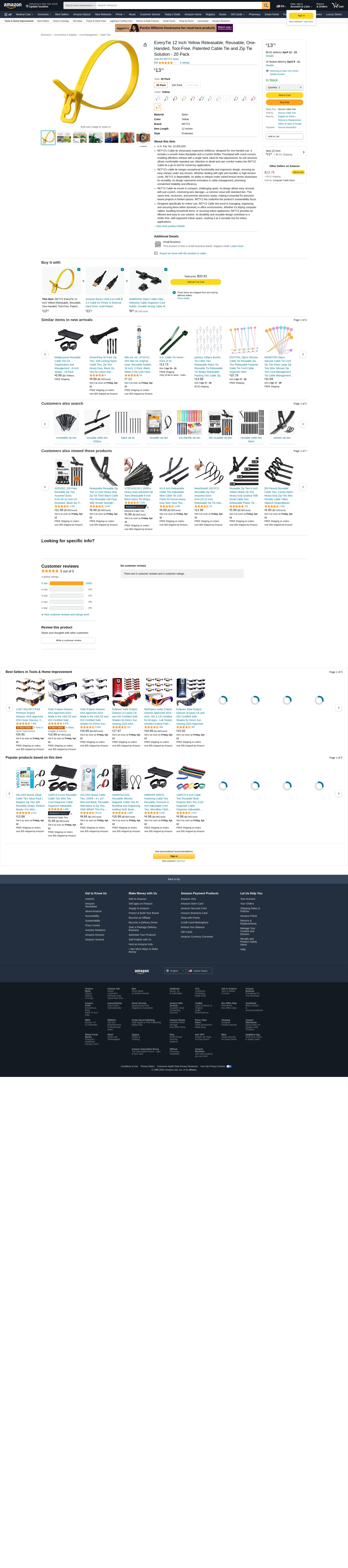 RETYZ EveryTie 12 Inch Yellow Releasable, Reusable, One-Handed, Tool-Free, Patented Cable Tie and Zip Tie Solution - 20 Pack