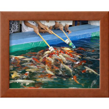 <ul> <li>Title: Feeding Koi Fish with Milk Bottle</li> <li>Artist: geargodz</li> <li>Product Type: Framed Art Print</li> <li>Framed in SOHO Pecan</li> <li>Arrives ready-to-hang for fast, simple installation</li> <li>Framed Size: 14x11 in.</li> <li>Handcrafted in the USA</li> </ul>