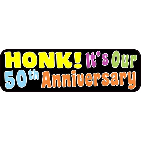 <h2 style="text-align: center;"><strong>10in x 3in (254mm x 76.2mm) Honk! It's Our Fiftieth Anniversary Bumper Magnet</strong></h2> <hr /> <strong>Honk! It's Our Fiftieth Anniversary Bumper Magnet Design:</strong>This bumper magnet is 10inches wide by 3inches tall when applied. It features the phrase, Honk! It's Our 50th Anniversary, in neon yellow, purple, green, light blue, and ...