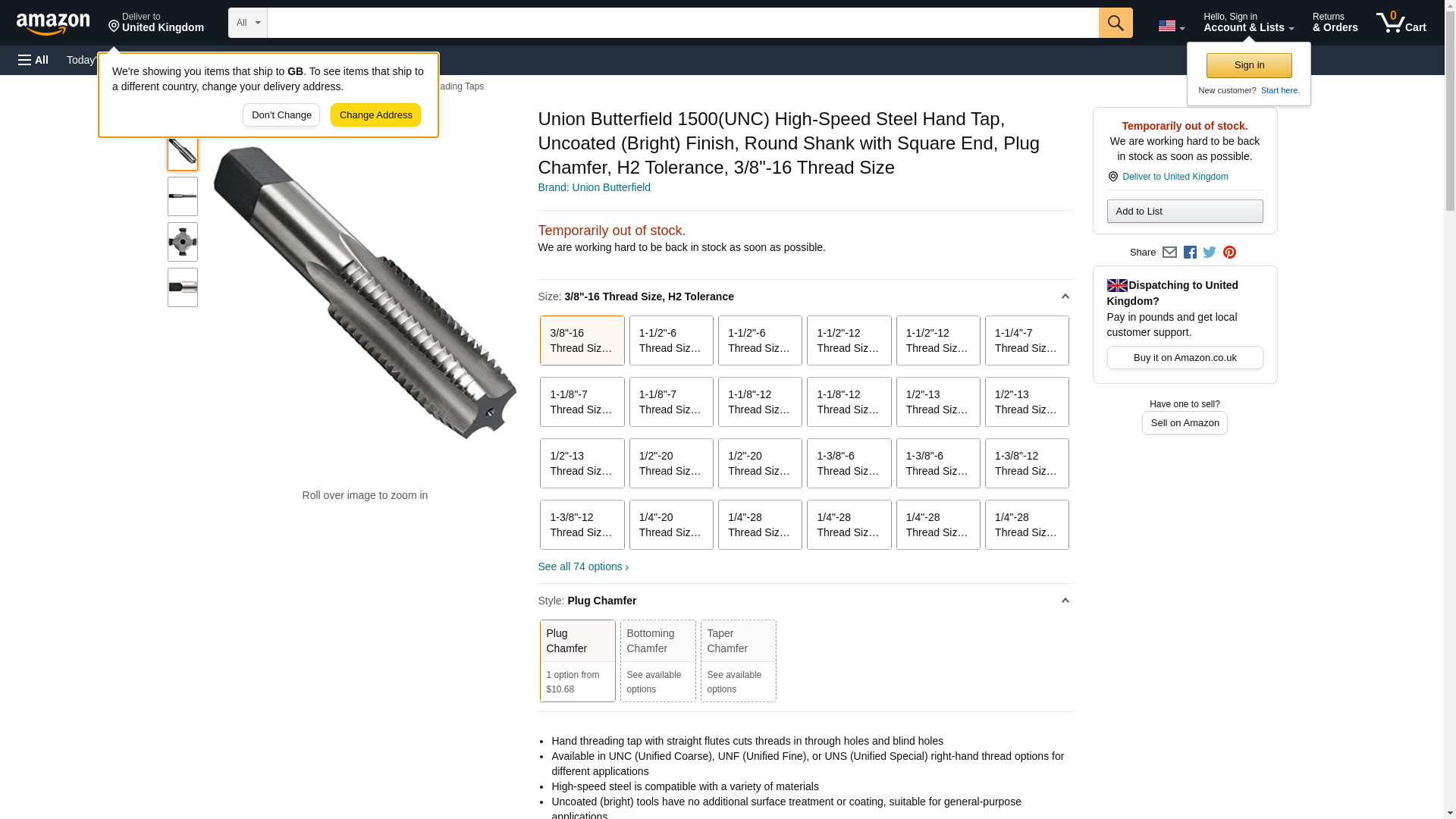 Union Butterfield 1500(UNC) High-Speed Steel Hand Tap, Uncoated (Bright) Finish, Round Shank with Square End, Taper Chamfer, H2 Tolerance, 3/8"-16 Thread Size