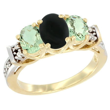 10K Yellow Gold Natural Black Onyx & Green Amethyst Ring 3-Stone Oval Diamond Accent