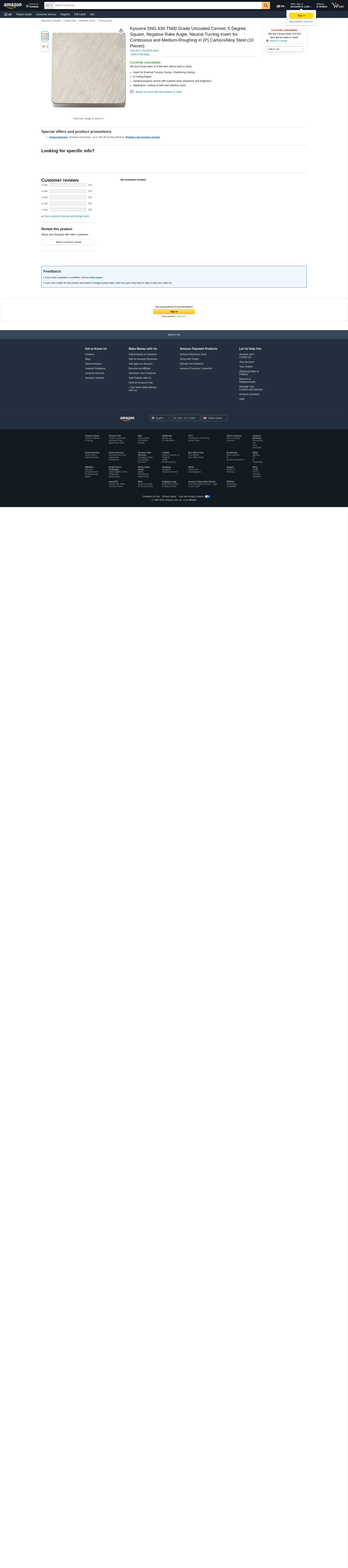 Kyocera SNG 634 TN60 Grade Uncoated Cermet, 0 Degree, Square, Negative Rake Angle, Neutral Turning Insert for Continuous and Medium-Roughing in (P) Carbon/Alloy Steel (10 Pieces)