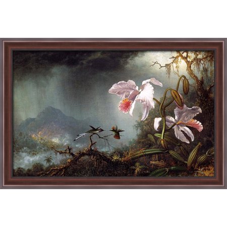 Two Fighting Hummingbirds with Two Orchids 40x26 Large Walnut Ornate Wood Framed Canvas Art by Martin Johnson Heade