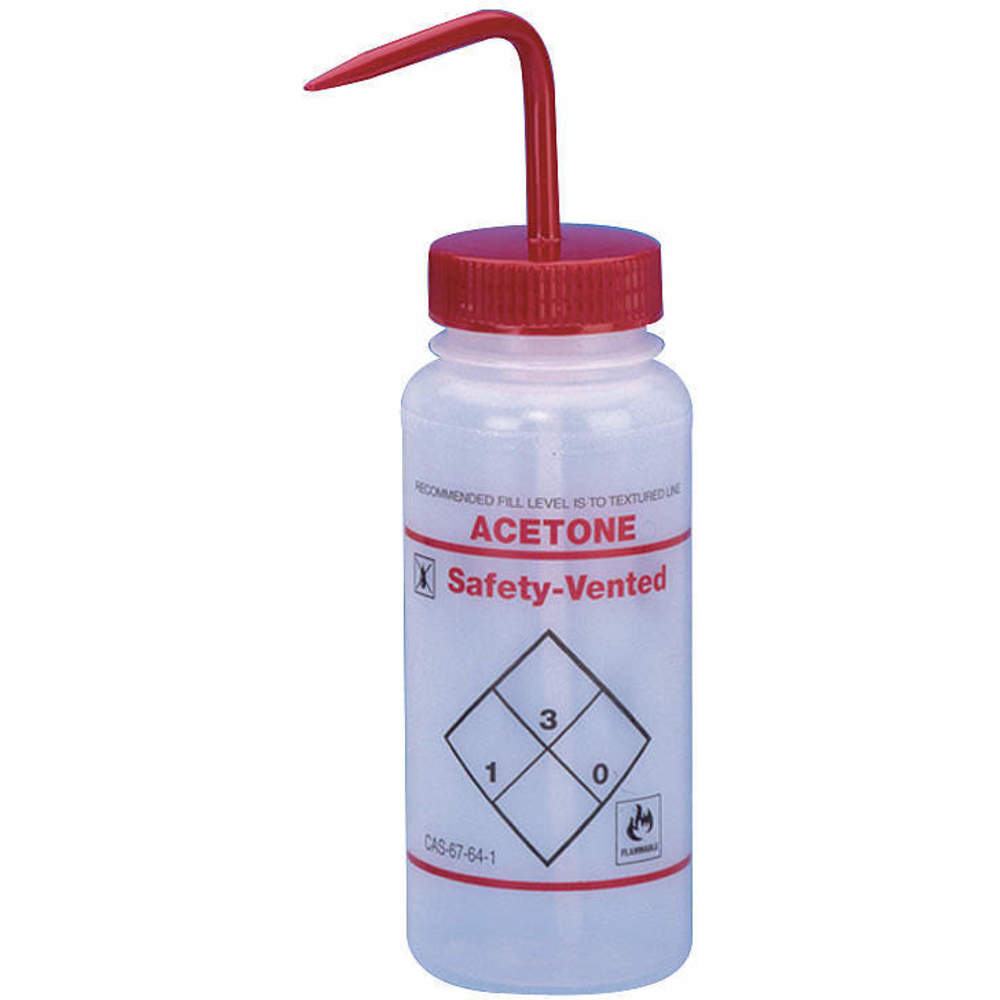 | Feature | Price For: Each Cap Material: Polypropylene Wash Bottle Style: Standard Spout Item: Wash Bottle Opacity: Translucent Bottle Material: LDPE Mouth: Wide Imprinting: Acetone Diameter: 53mm Venting: Vented Color: Clear Capacity: 500mL Country of Origin (subject to change): United States |