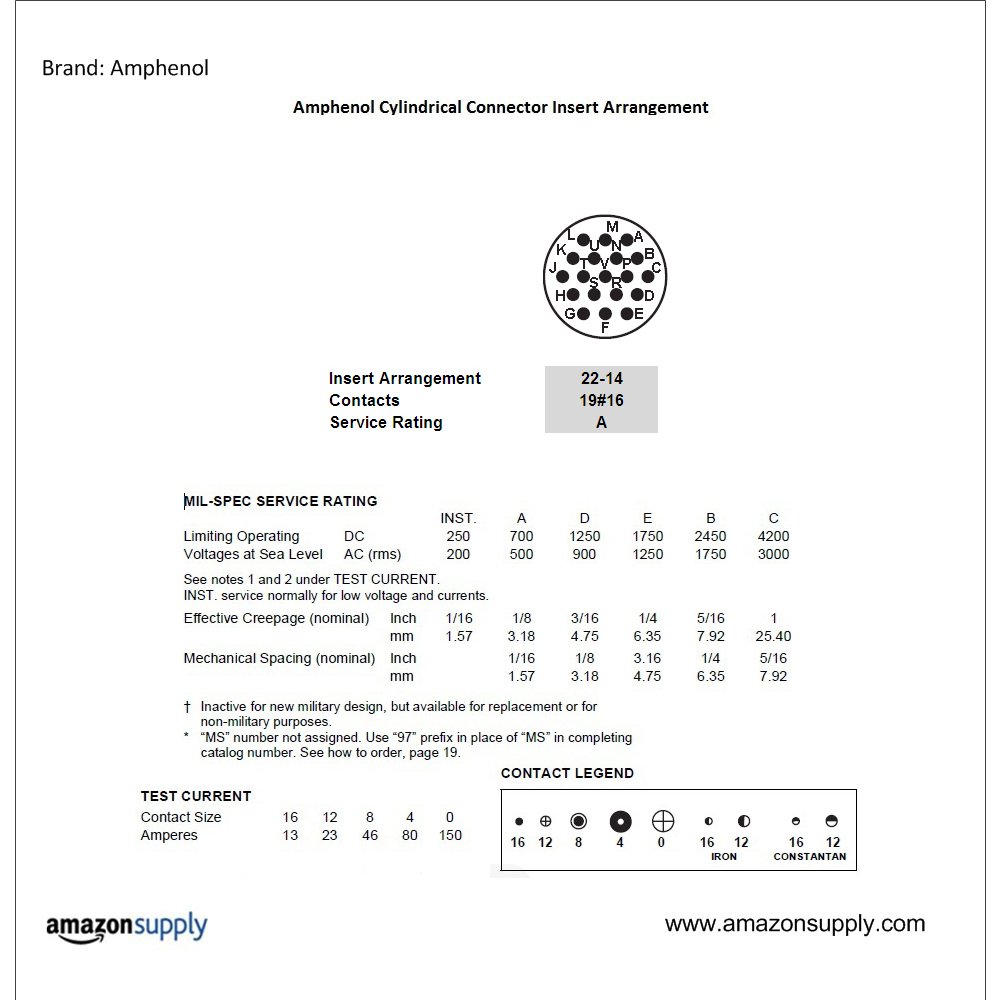 Amphenol Industrial 97-3106A-22-14P Circular Connector Pin, Threaded Coupling, Solder Termination, Straight Plug, Solid Backshell, 22-14 Insert Arrangement, 22 Shell Size, 19 Contacts