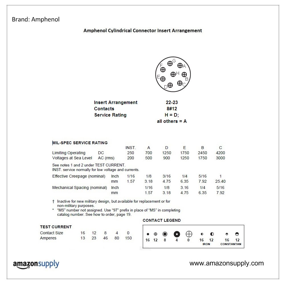 Specification: MIL-DTL-5015<br>Shielding: Yes<br>Connector Type: Circular<br>Connector Style: Plug<br>Mounting Type: Cable<br>Orientation: Straight<br>Endbell Type: Threaded - UNEF - Ext<br>Number of Contacts: 8<br>Contact Style: Socket<br>Termination Method: Solder<br>Insert Arrangement: 22-23<br>Contact Size: 8#12<br>Contacts Supplied: Yes<br>Contact Material: Brass or Copper Alloy<br>Contact Plating: Silver<br>Shell Material: Aluminum Alloy<br>Shell Plating: Olive Drab Chromate over Cadmium<br>Shell Color: Olive Drab<br>Insert Material: Diallyl Phthalate<br>Amperage Rating: 23A<br>Operating Voltage DC: 1250/700<br>Operating Voltage AC: 900/250<br>Operating Temperature: +257 (+125) for 60 hours, +185 (+85) for 1000 hours<br>Contact Mating life: 100<br>RoHS: No<br>Insert Rotation Keying: Normal