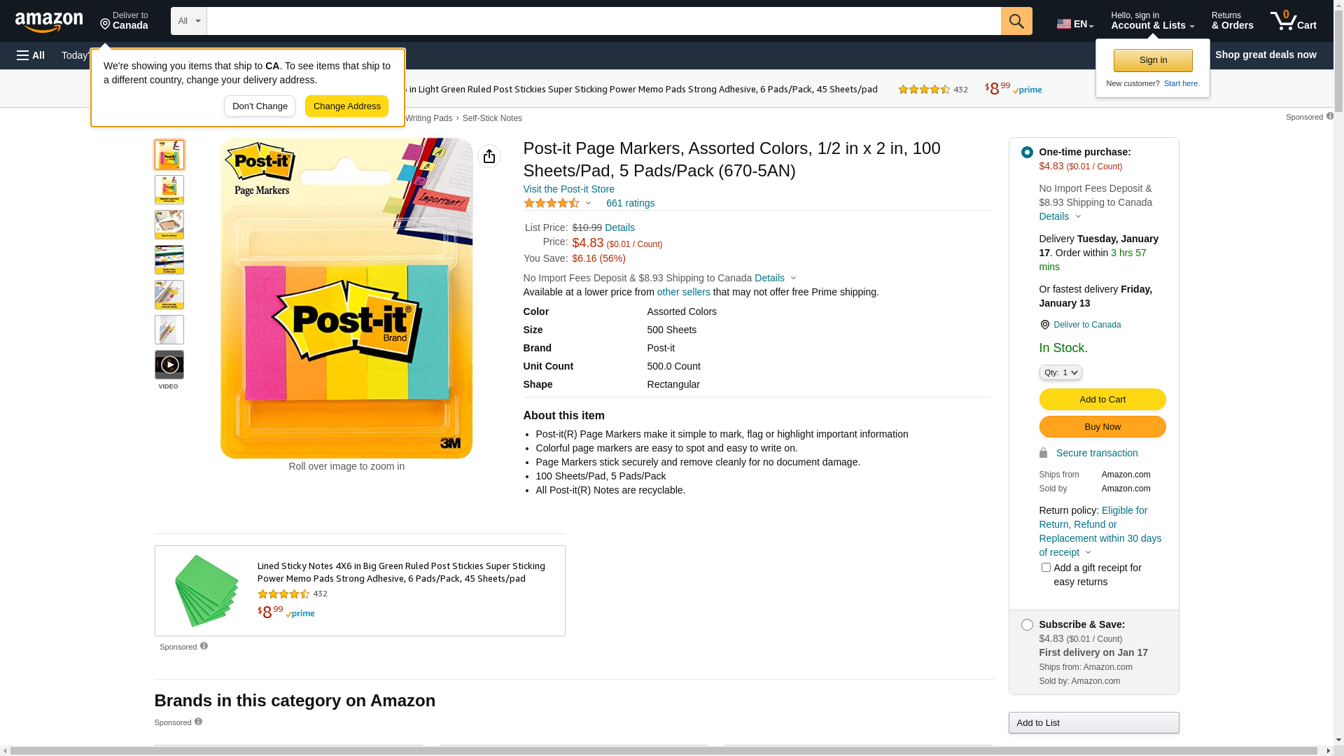 Post-it Page Markers, Assorted Colors, 1/2 in x 2 in, 100 Sheets/Pad, 5 Pads/Pack (670-5AN)