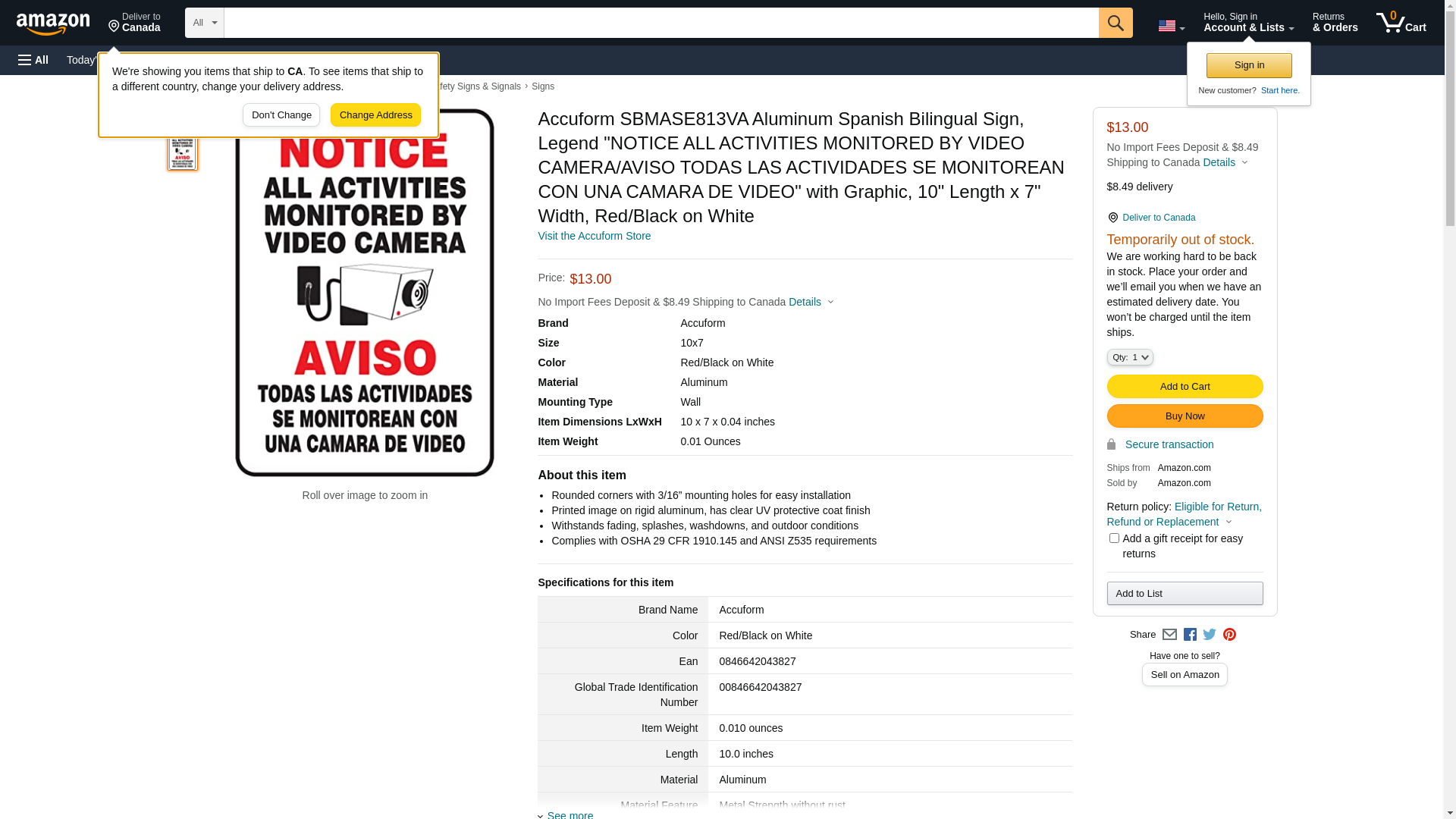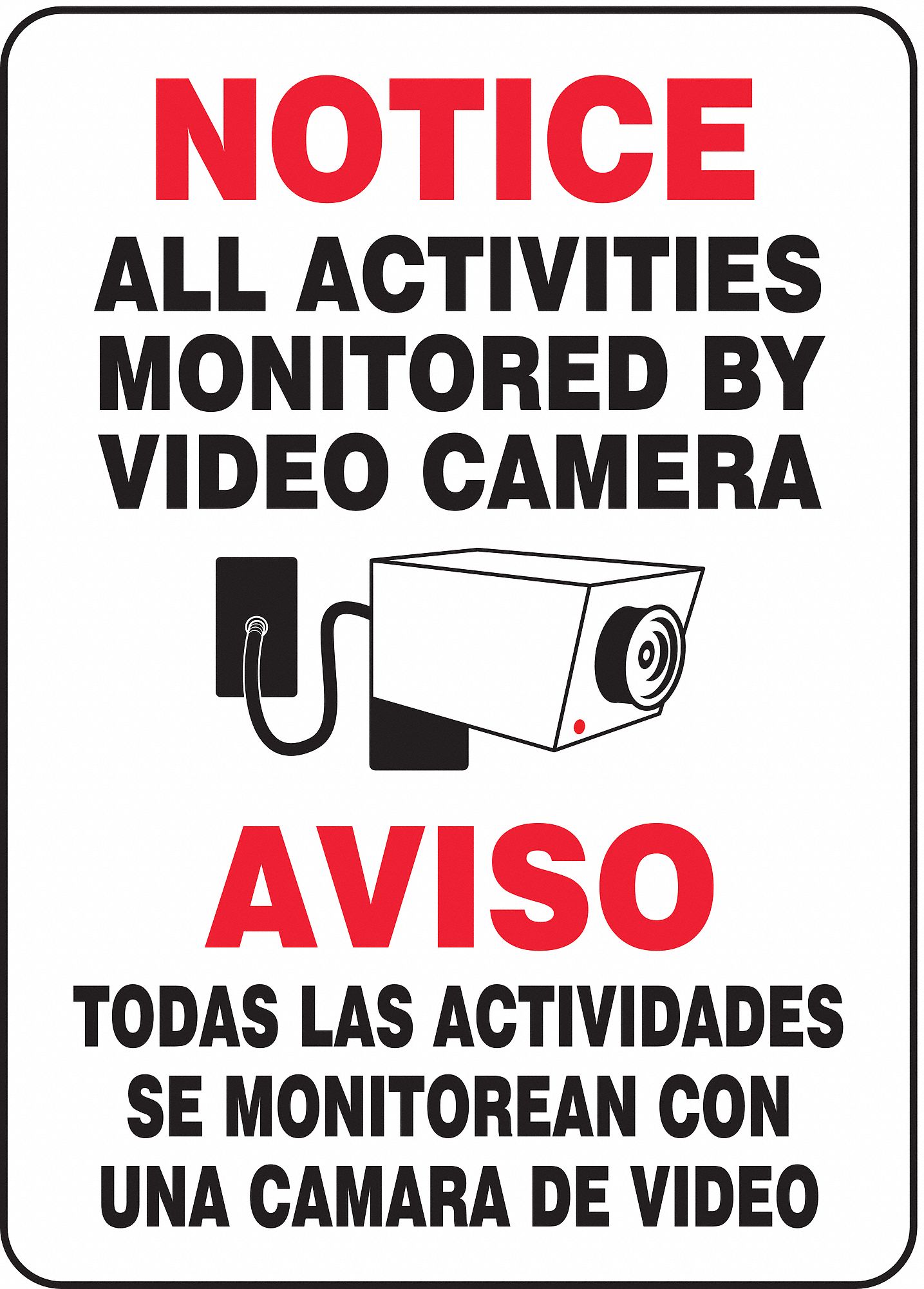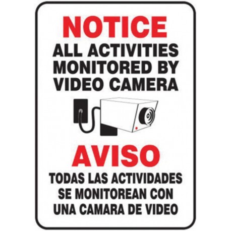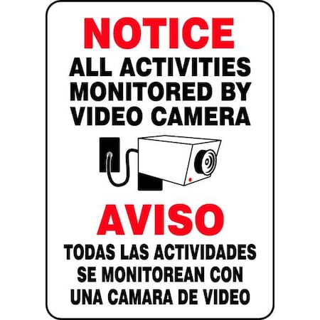 Accuform SBMASE813VA Aluminum Spanish Bilingual Sign, Legend "NOTICE ALL ACTIVITIES MONITORED BY VIDEO CAMERA/AVISO TODAS LAS ACTIVIDADES SE MONITOREAN CON UNA CAMARA DE VIDEO" with Graphic, 10" Length x 7" Width, Red/Black on White