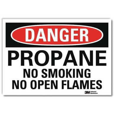Danger No Smoking Sign, Horizontal Rectangle, Number of Printed Sides 1, English, Sign Format Traditional OSHA, Sign Legend Propane No Smoking No Open Flames, Sign Legend Background Color White, Sign Legend Style Text