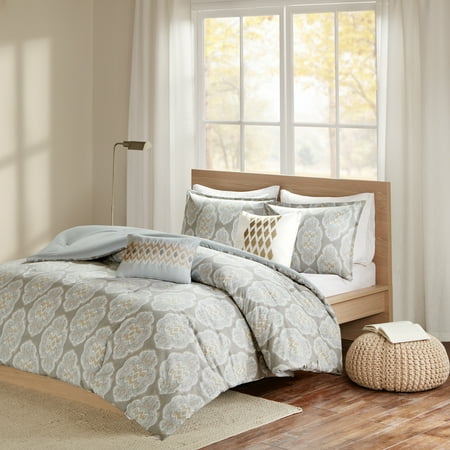 <ul> <li>Full/Queen Set Includes: 1 Comforter (88x92"), 2 Standard Shams (20x26+1"), 2 Decorative Pillows (18x18"/12x18")</li> <li>King/Cal King Set Includes: 1 Comforter (104x92"), 2 King Shams (20x36+1"), 2 Decorative Pillows: (18x18"/12x18") </li> <li>Comforter/Sham: 200TC cotton percale, printed, 144TC reverse, 250g/m2 polyester filling </li> <li>Pillow: cotton cover, polyester filling </li> <li>Machine Washable<br /></li> </ul>