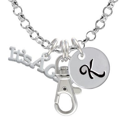 Silver Tone Large "It's a Girl" - K - Initial Badge Clip Necklace. Silver Tone, hand enameled charms. Charm size is approx. 0.42 x 1.25 x 0.06 inches (HxWxD) including loop. 5 mm Rolo Chain Necklace: 34 Inches. Large Swivel Clip is approx. 1.43 x 0.65 x 0.25 Inches (HxWxD). Script Initial Disc is approximately 0.77 x 0.77 x 0.8 Inches (HxWxD). Dress up your ID with this beautiful and unique necklace. Wonderful gift for anyone who wears a badge or ID. Please notify us if you would like an initial not listed here. We are a family owned company in the U.S.A since 1977. PLEASE NOTE: Our products are lead safe, but are not intended for children 14 years and younger.