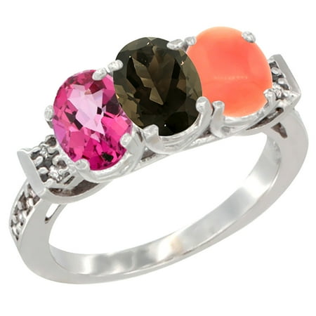 14K White Gold Natural Pink Topaz, Smoky Topaz & Coral Ring 3-Stone 7x5 mm Oval Diamond Accent, sizes 5 - 10