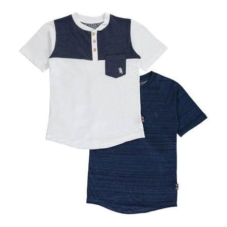 Stock up on stylish quality with these English Laundry T-shirts! <ul> <li>English Laundry 2-pack T-shirts</li> <li>Burnout jersey Henley T-shirt with heather trim, embroidered chest pocket, and rib-knit neckline with tagless interior (60% cotton, 40% polyester)</li> <li>Marbled jersey T-shirt with tagless rib-knit neckline (60% cotton, 40% polyester)</li> <li>Machine wash cold</li> <li>Imported</li> </ul>