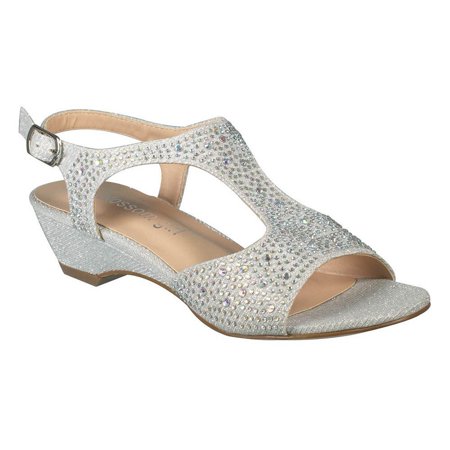 <ul> <li>An elegant pair of low platform wedges featuring a sparkle silhouette covered with shimmer rhinestones from De Blossom Girl</li> <li>Silver sandal has wedge low heel, t-strap design and ankle buckle</li> <li>Slightly padded cushioned insole and flexible sole form extra-comfort, german manmade custom outsole</li> <li>Sparkle Material / Rhinestones</li> <li>Sizing is based on U.S. shoe size standards. Contact us if you have any questions</li> </ul>