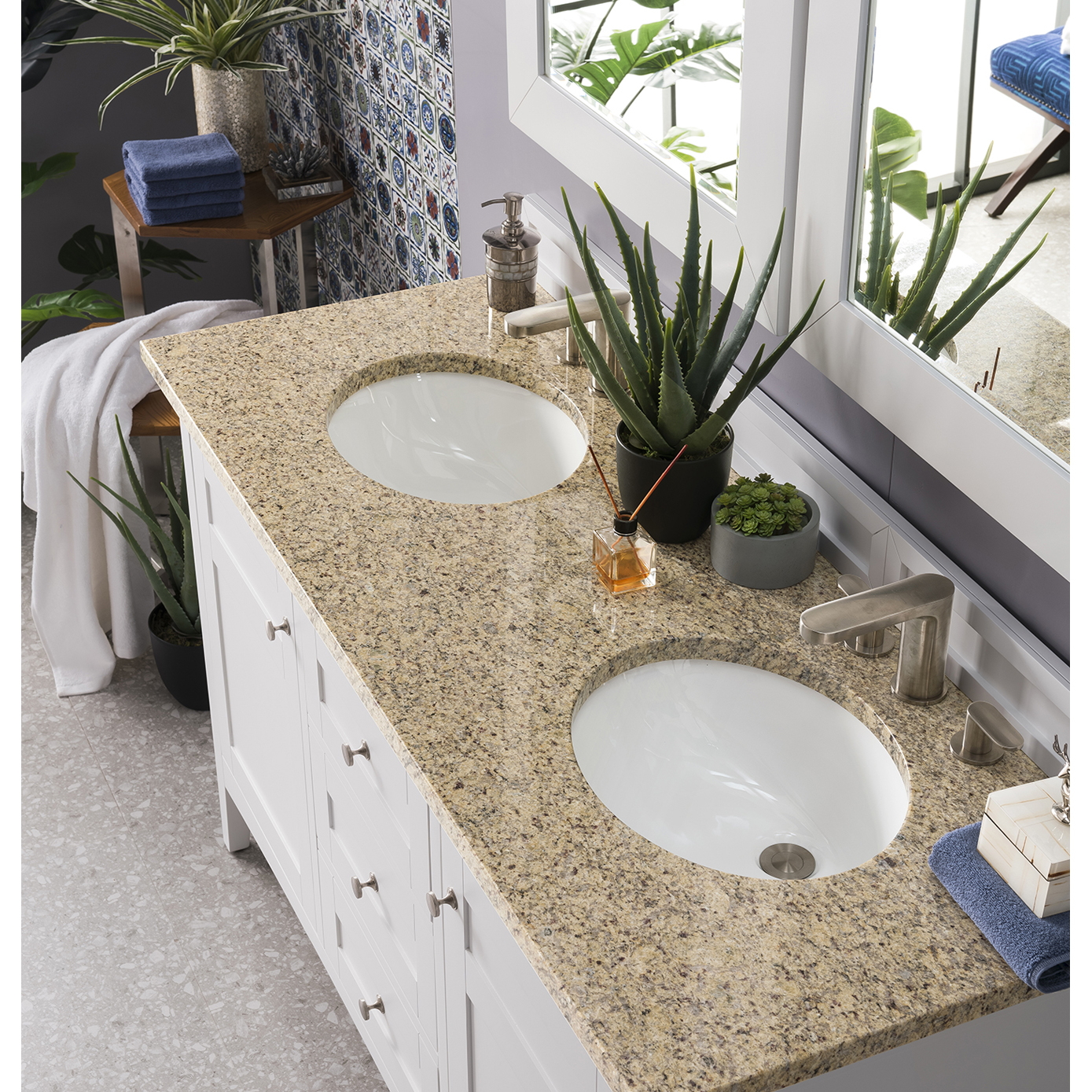 Standard Plumbing Supply - Product: Palisades 60" Double Vanity, Bright White, with 3 CM Santa Cecilia Top w/ Oval Sink