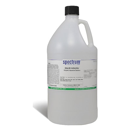 Starch Indicator, Aqueous Solution, Stabilized, Concentration 1 Percent w/v, Chemical Container Material Plastic, Chemical Container Type Jug, Chemical Grade Lab, Chemical Container Size 4 L, Chemical Family Type Standards and Solutions, Shelf Life 24 mo, Shipping Restrictions Chemical Not Regulated For Transport, Special Information For Iodometric Titrations