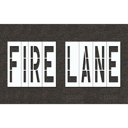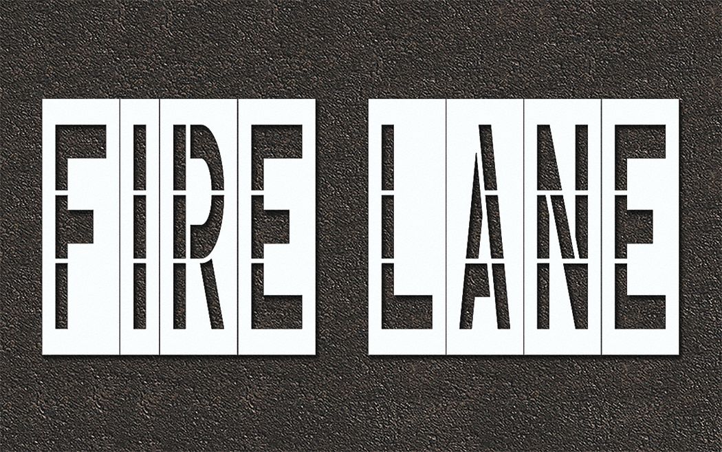 Pavement Stencil, Character Type Message, Duty Heavy, FAA AC 150/5340-1K Compliant No, Font Highway Gothic, Included Characters, Messages, and Symbols Fire Lane, Includes Fire Lane, Individual Character Height Not Applicable, Individual Character Width Not Applicable, Interlocking No, Interlocking Orientation Not Applicable, Material Polyethylene, Message or Symbol Height 48 in, Message or Symbol Width 129 in, Number of Pieces 1, Overall Stencil Height 60 in, Overall Stencil Thickness 0.125 in