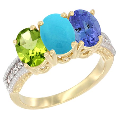 10K Yellow Gold Natural Peridot, Turquoise & Tanzanite Ring 3-Stone Oval 7x5 mm, sizes 5 - 10
