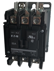 The Eaton C25DNJ350B is a 50 AMP, 3 pole Definite Purpose contactor that has a 208-240 volt AC coil. It has double quick connect terminals and available side mounted auxiliaries.