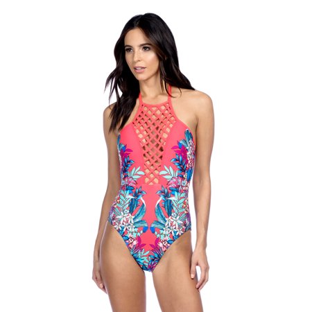 Kenneth Cole Women's Tropical Tendencies Lattice High Neck Mio One Piece Swimsuit Fabric Content: 84% Nylon, 16% Elastane High Neck Tummy Toner Lattice Front detail Halter One Piece Removable Cups High Leg Torso SKU: KC7JM08