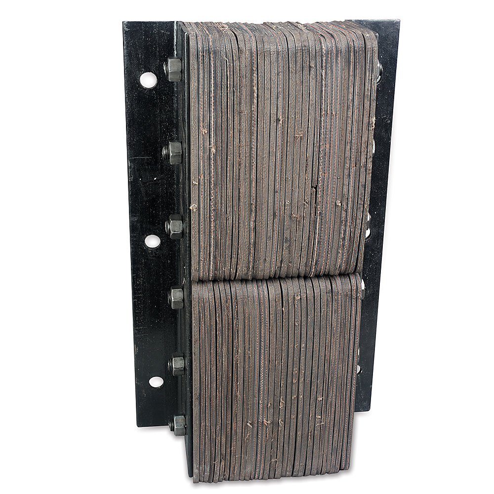 Rubber impregnated pads are secured by adjustable threaded rods to 2 1/2x3", 1/4" thick angle iron bracket; brackets have 1/2" holes for securing.