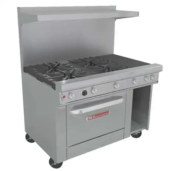 Southbend's Ultimate Restaurant Range, gas, 48", (4) pyromax burners, (2) non-clog burners right, standing pilot, (1) standard oven with battery spark ignition, (1) cabinet base, includes (1) rack, 22-1/2" flue riser with shelf, stainless steel front, sides, shelf & 6" adjustable legs, 271,000 BTU, CSA, NSF. Standard one year limited warranty (range). NOTE: 22.5" high flue riser, with heavy duty shelf, standard.