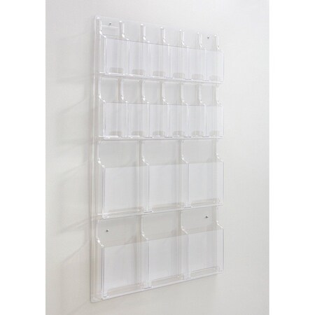 Think outside the box by looking in! Design displays literature clearly. Unobtrusive, break-resistant, clear plastic racks blends into any office environment. Each pocket holds up to 1 3/4" of material. New front panel design features easy-to-clean opening. All are single-piece units and require no assembly. Wall mounting hardware included. 6 Magazine, 12 Pamphlet. Color: Clear Overall Width: 30" Overall Depth: 2" Overall Height: 45". Unit of Measure : Each