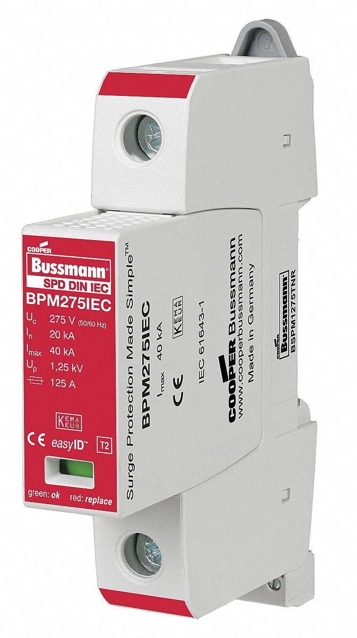 This device provides high-surge discharge capacity due to heavy-duty zinc oxide varistor and spark-gap technology. The modular DIN-rail design with color-coding and rejection features makes it easy to identify, install, and maintain. Status monitoring is simple with easyID visual indication.<br /><br /> Item: Surge Protection Device<br /> Phase: 1<br /> Voltage: 230VAC<br /> Max. Continuing Operating Voltage: 385VAC<br /> Voltage Protection Rating: 1750V (L-G)<br /> Nominal Discharge Current: 20kA<br /> Modes of Protection: L-G<br /> Filtering / Nonfiltering: Nonfiltering<br /> Modular / Nonmodular: Modular<br /> Mounting Style: DIN Rail<br /> Enclosure Material: Thermoplastic<br /> IP Rating: 20<br /> Length: 3.54"<br /> Width: 0.71"<br /> Depth: 2.56"<br /> Max. Surge Current Per Phase: 40kA<br /> Max. Surge Current Per Mode: 40kA<br /> Number of Poles: 1<br /> Number of Wires: 2<br /> Wire Gauge: 14 to 2 AWG<br /> Standards: IEC 61643-1, KEMA, CSA<br /> Includes: Installation Instructions