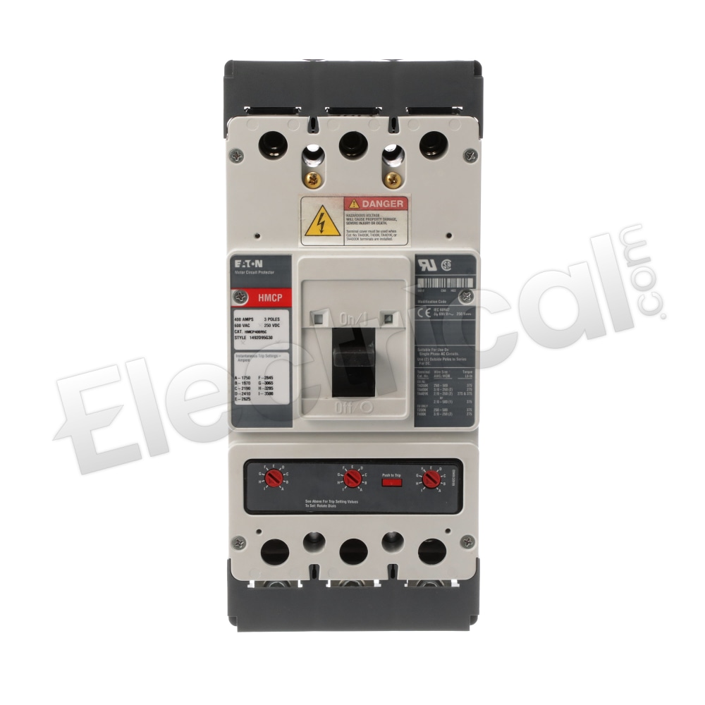 Mfr Brand Name: CUTLER HAMMER / Catalog No.: HMCP400R5C / Product Name: CUTLER HAMMER HMCP400R5C N 400A 600V 3P NEW / Amps: 400 / Volts: 600 / Poles: 3 / Trip Range: 1750-3500