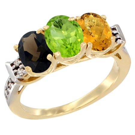 14K Yellow Gold Natural Smoky Topaz, Peridot & Whisky Quartz Ring 3-Stone Oval 7x5 mm Diamond Accent, sizes 5 - 10