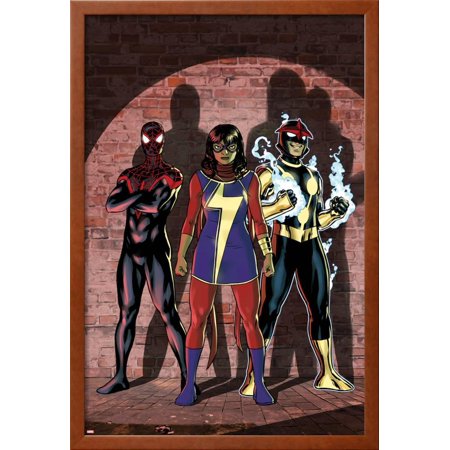 <ul> <li>Title: Ms. Marvel No. 7 Cover Art Featuring: Ultimate Spider-Man Morales, Ms. Marvel (Kamala Khan), Nova</li> <li>Artist: Cameron Stewart</li> <li>Product Type: Framed Art Print</li> <li>Framed in SOHO Pecan</li> <li>Arrives ready-to-hang for fast, simple installation</li> <li>Framed Size: 26x38 in.</li> <li>Handcrafted in the USA</li> </ul>