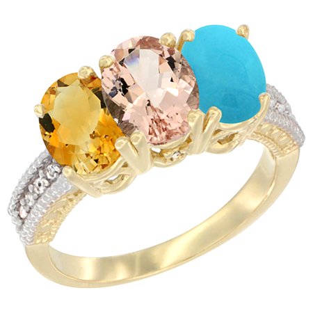 14K Yellow Gold Natural Citrine, Morganite & Turquoise Ring 3-Stone 7x5 mm Oval Diamond Accent, sizes 5 - 10