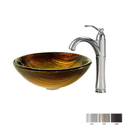 <p><strong>What's Included in this Bathroom Combo:</strong></p> <ul> <li>Tempered glass vessel sink</li> <li>Solid brass vessel faucet</li> <li>Pop-up drain (matches faucet finish)</li> <li>Mounting ring</li> <li>All necessary hardware for mounting</li> </ul> <strong>Sink Features:</strong> <ul> <li>Fully covered under Kraus' limited lifetime warranty</li> <li>Constructed of solid tempered (toughened) glass - virtually unbreakable</li> <li>Should glass somehow break, tempering also means it crumbles rather than creating shards</li> <li>Handmade by skilled artisans</li> <li>A fashionable bathroom sink is the perfect harmony of elegance and style</li> <li>This eye catching glass vessel sink will turn an ordinary bathroom into a lavish space</li> <li>Hand painted / textured finish is applied to bowl exterior</li> <li>Extra thick, 3/4" glass is perfect for those who want the sink to make a bold statement</li> <li>Designed for above-the-counter installation</li> <li>Standard 1-3/4" drain opening - designed to easily connect to waste lines, including P-traps</li> <li>Extra secure mounting assembly</li> <li>Certifications and Listings Include: UPC, cUPC, CSA, IAPMO, ANSI and SCC</li> </ul> <strong>Faucet Features:</strong> <ul> <li>Fully covered under Kraus' limited lifetime warranty</li> <li>All-brass faucet construction</li> <li>High-quality, corrosion and rust resistant triple-plated finish - finish covered under lifetime warranty</li> <li>Single handle operation</li> <li>Tall design for use with vessel (above-the-counter) sinks</li> <li>ADA compliant</li> <li>Low lead compliant - complies with federal and state regulations for lead content</li> <li>Designed to easily connect to standard U.S. plumbing supply</li> </ul>