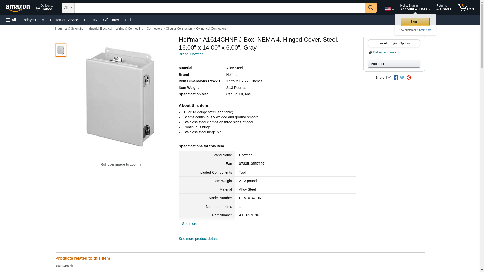 | Feature | HOFFMAN ENCLOSURES A1614CHNF ENCLOSURE, JUNCTION BOX, STEEL, GRAY |