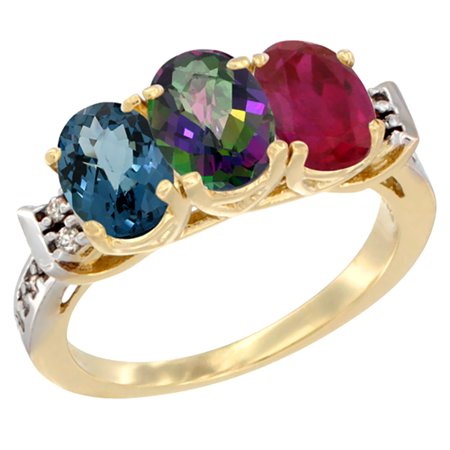 10K Yellow Gold Natural London Blue Topaz, Mystic Topaz & Enhanced Ruby Ring 3-Stone Oval 7x5 mm Diamond Accent, sizes 5 - 10