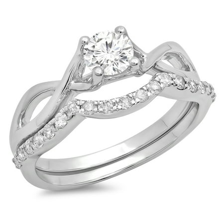 Stunning wide Center Stone with tons of Sparkle add charm to this Bridal wedding set. 0.80 CT 18K White Gold Ladies Round Wedding Bridal Engagement Ring with Matching Band Set. On your Engagement day pledge your love and complete the ensemble by adding the diamond-lined Engagement band. Buffed to a brilliant shine this exquisite bridal set forms a beautiful union just like your love. Don't pay higher prices from other jewelry retailers -- let Dazzling rock be your number one choice every time.