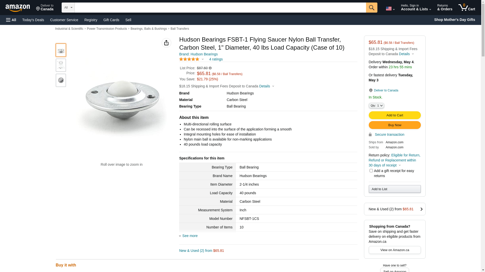 Hudson Bearings FSBT-1 Flying Saucer Nylon Ball Transfer, Carbon Steel, 1" Diameter, 40 lbs Load Capacity (Case of 10)