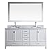 Includes matching framed mirror and backsplash. Carrera white marble countertop with 1.5 in. edge. Countertop pre-drilled for 8 in. widespread faucets. Four soft-closing doors with adjustable hinges. Six full extension dovetail soft-closing drawers. Two ceramic and round under-mount sinks. cUPC certified. Satin nickel finish hardware. Made from solid wood. Wooden framed mirror: 70.9 in. W x 39 in. H. Vanity: 73 in. W x 22 in. D x 35 in. H.