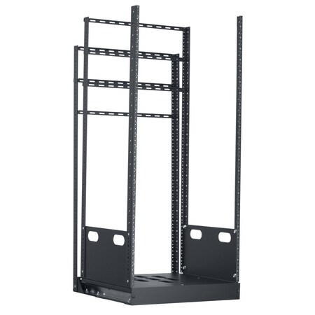 Lowell LPTR4-2423 Pull and Turn Rack 24U x 23D; Removable Base Mounts Flush or Recessed (Up to 1.75 Inches); Integral Turntable with Push-Button Release<br><br> For built-in applications in credenzas, cabinetry or millwork, the top section of the rack slides forward on four (4) support rails set into its base, then rotates left or right and locks at 60 or 90 degrees for superior access to equipment and connections. The rack features 4 corner post mounting rails and a front securing/finishing panel. Ships unassembled in 2 cartons<br><br> Key Features:<br> - Removable base mounts flush or recessed (up to 1.75 inches)<br> - Integral turntable with push-button release<br> - 4 bottom rail slides (for loads to 200 lbs)<br> - 11-gauge steel corner post mounting rails tapped 10-32<br> - Front panel attaches with screws to secure rack in the rolled-back position<br> - Side stiffeners for torsional rigidity<br> - 6 cable lacing bars<br> - Black powder epoxy finish<br> - Ships unassembled (2 cartons)<br><br> Specifications:<br> - Load Capacity: 200 lbs - Post Mounting Rails (4): 24U<br> - Rear Tie Rails (2): 23U<br> - Bottom Slide Rails: 4<br> - Construction: 14-ga. certified U.S. steel base and 11-ga. corner post rails; 2 side support brackets<br> - Finish: smooth black powder epoxy finish<br> - Compliance: EIA/TIA compliant. RoHS compliant<br> - Rack Space: 24U<br> - Height: 44.65 inches<br> - Width: 19.13 inches<br> - Depth: 23.69 inches (23 usable)<br> - Shipping Weight: 86 lbs