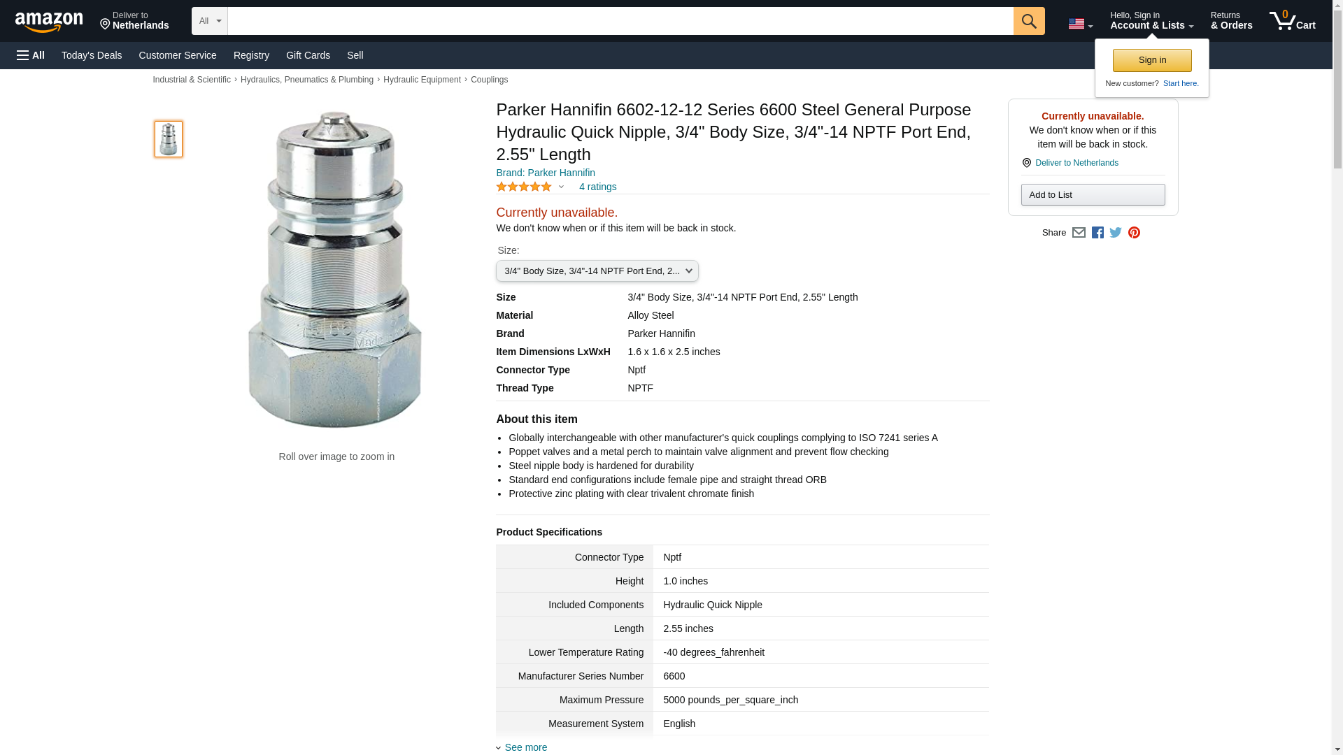 - Item|Hydraulic Quick Connect Nipple#Brand|Parker#Model|6602-12-12#Body Size|3/4 Inch#Port Connection|3/4 Inch NPTF Female#Type|6100 Series#Isolation|Poppet Valve#Style|Manual Sleeve#Max Pressure|4000 PSI#Material|Steel#Seal Material|Nitrile