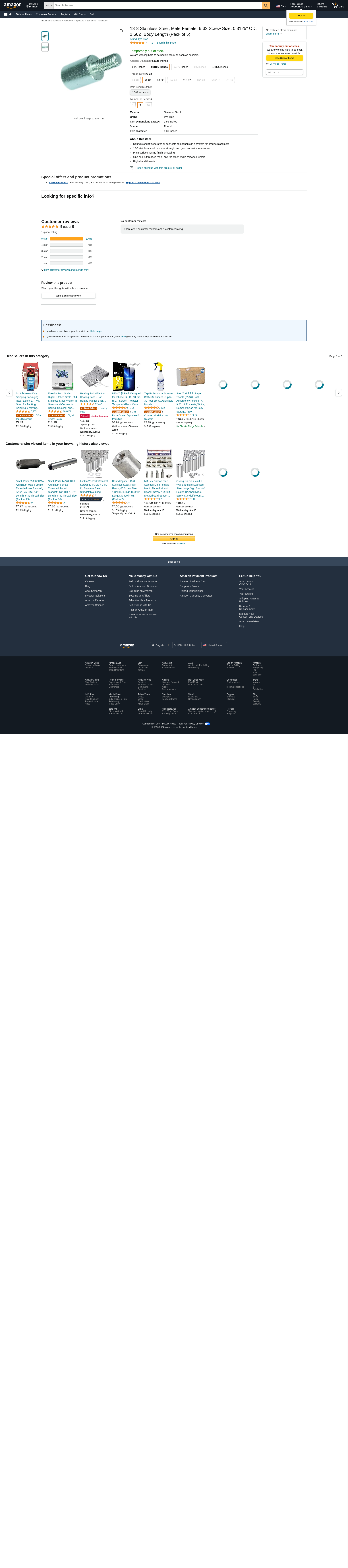 Lyn-Tron, 18-8 Stainless Steel, Male-Female, 6-32 Screw Size, 0.3125" OD, 1.562" Body Length (Pack of 5)