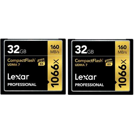 <p>The 32GB Professional 1066x CompactFlash Memory Card (UDMA 7, 2-Pack) from Lexar features a 32GB storage capacity perfect for storing large files including high-quality photos, 1080p Full-HD, 3D, and 4K video. With a 1066x speed rating, this card is capable of achieving data read speeds of up to 160 MB/s and data write speeds of up to 155 MB/s, allowing you to transfer your files via the card-to-computer transfer method via a UDMA 7-enabled card reader. </p><strong>Features</strong><ul><li>32GB Data Storage Capacity</li><li>1066x Speed Rating</li><li>Max. Read Speed 160 MB/s</li><li>Max. Write Speed 155 MB/s</li><li>Min. Write Speed 65 MB/s</li><li>UDMA 7 Compliant</li><li>Pack of 2</li></ul><strong>Specifications</strong><ul><li><strong>Card Type:</strong> CompactFlash Type I</li><li><strong>Storage Capacity:</strong> 32 GB</li><li><strong>Speed:</strong> 1066x</li><li><strong>Ultra Direct Memory Access:</strong> UDMA 7 Compliant</li><li><strong>Read Speed:</strong> 160 MB/s</li><li><strong>Write Speed:</strong> 155 MB/s</li><li><strong>Durability:</strong> Shockproof, Static Proof, Temperature Extremes</li><li><strong>File System:</strong> FAT32</li><li><strong>Weight:</strong> 0.1 lbs</li></ul>