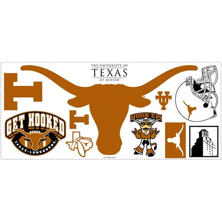 <br /> <b>RoomMates University of Texas Peel-and-Stick Giant Wall Decal with Hooks:</b> <ul> <li>Peel and stick</li> <li>Removable</li> <li>Repositionable</li> <li>No sticky residue</li> <li>Easy to hang</li> <li>Comes with 11 decals</li> <li>Decals range in size from 3" x 3.5" to 32" x 16.25"</li> </ul>