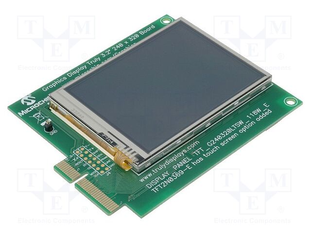 | Feature | <b>Price For:</b> Each<b>Order Unit:</b> Each\xa01 <b>Core Architecture:</b>: PIC <b>Core Sub-Architecture:</b>: PIC24 <b>Features:</b>: 3.2" QVGA (240x320) TFT LCD with 18-Bit Parallel RGB Interface, Resistive 4-Wire Touch Screen <b>Kit Contents:</b>: Graphics Display Truly 3.2 240x320 Board, Daughter Board connection interface <b>No. of Bits:</b>: 8bit <b>SVHC:</b>: No SVHC (17-Dec-2014) <b>Silicon Core Number:</b>: PIC24F |