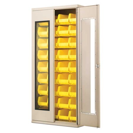 Quick-View Security Cabinet, Cabinet with Quick View Doors, Louvered Back with 30240 yellow Bins36“ x18“ x78“ The Quick-View Security Bin Cabinet allows you to identify contents while protecting parts from dust, damage, and theft. Constructed of powder-coated 16-gauge steel with break-resistant, see-through Lexan™ inserts. Louvered back wall for AkroBins which holds up to 36 bins. Bin Model No. /Color / Bin Dimension (LxWxH), inches / Quantity of Bins30240 / Yellow / 14-3/4“ x 8-1/4“ x 7“ / 36 Product photo may not exactly match the product offered for sale. Please refer to the product description.