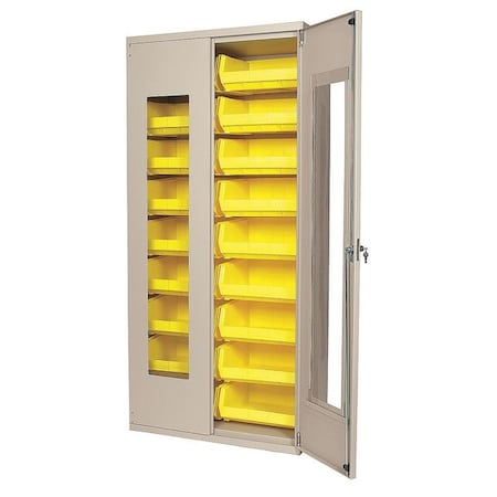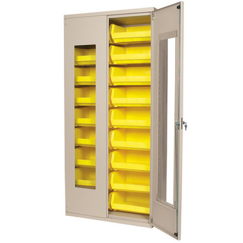 Quick-View Security Cabinet, Cabinet with Quick View Doors, Louvered Back with 30250 yellow Bins36“ x18“ x78“ The Quick-View Security Bin Cabinet allows you to identify contents while protecting parts from dust, damage, and theft. Constructed of powder-coated 16-gauge steel with break-resistant, see-through Lexan™ inserts. Louvered back wall for AkroBins which holds up to 36 bins. Bin Model No. /Color / Bin Dimension (LxWxH), inches / Quantity of Bins30240 / Yellow / 14-3/4“ x 16-1/2“ x 7“ / 18 Product photo may not exactly match the product offered for sale. Please refer to the product description.